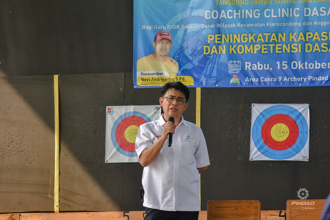 Dalam sambutannya, Manajer TJSL Yunus Somantri menjelaskan tujuan kegiatan ini adalah untuk membekali para pengajar di bidang olahraga agar bisa mengajarkan kembali teknik dasar olahraga panahan kepada peserta didik. “Kita coba realisasikan tindak lanjut pertemuan kita di awal dengan guru-guru PJOK, agar pelaksanaan peningkatan kapasitas teknik dasar panahan yang akan disampaikan bisa bermanfaat bagi anak didik kita di sekolah. Selain manfaat fisik, olahraga panahan bermanfaat untuk meningkatkan fokus, konsentrasi, dan ketenangan diri. Semoga kolaborasi pentahelix ini bisa berkembang dan juga mampu menghasilkan prestasi dari guru maupun anak didik yang kita bina,” terang Yunus Somantri.
